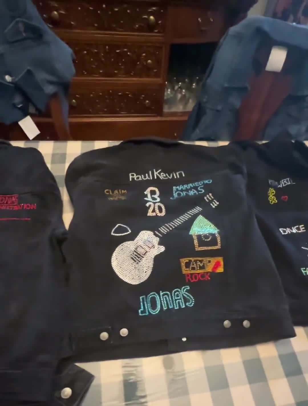 The custom rhinestone jackets I made for Nick, Kevin & Joe Jonas. I was able to give them to Franklin Jonas so he could give them to his brothers for me.